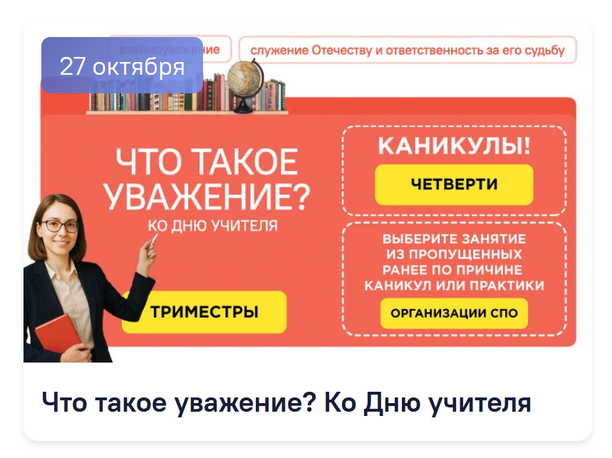 Каждый понедельник первым занятием во всех школах и СПО страны проходят «Разговоры о важном». Основные темы связаны с ключевыми аспектами жизни человека в современной России. Комплект методических материалов для педагогов носит рекомендательный характер.